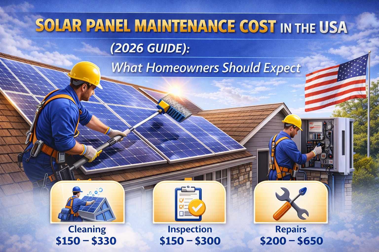 Solar panel maintenance costs in the United States are relatively low compared to other home energy systems. Most homeowners spend between $150 and $500 per year on cleaning, inspections, and minor repairs.